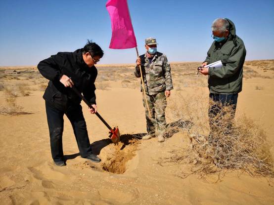 (阿拉善生态基金会工作人员在老虎公益纪念林种植梭梭树)