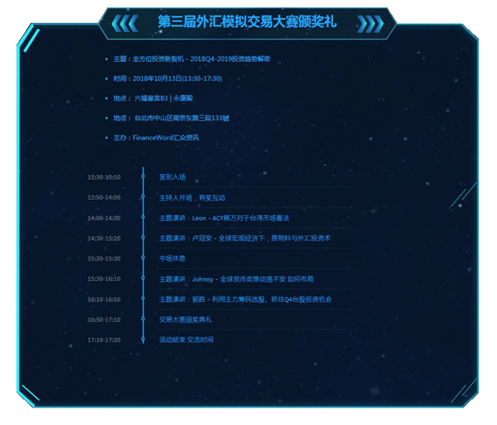 ACY稀万将于10月13日在台北·威斯汀六福皇宫酒店举办高端外汇交流会,本次交流会以“全方位投资新契机2018Q4-2019投资趋势解密”为主题,聚外汇行业精英,共同探讨金融市场趋势为投资者解读如何抓住“财富”把握投资机遇。同时,将公布第三届外汇模拟交易大赛最终获奖名单,幷举办颁奖礼。