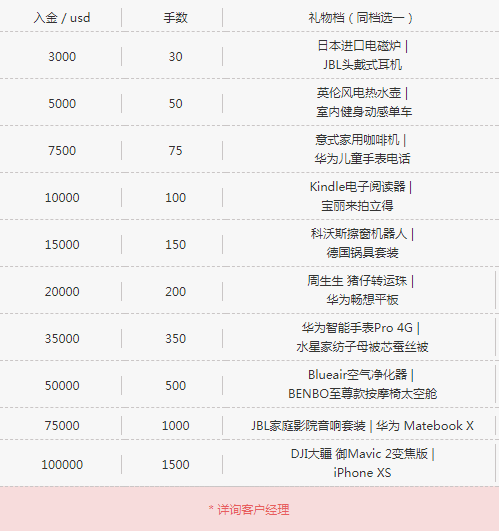 申请参加此次活动请先到您的客户经理处报名,需要满足相应的入金量及交易量要求才能获得相应礼品。